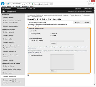 Si se selecciona [Rechazar] para un filtro de salida