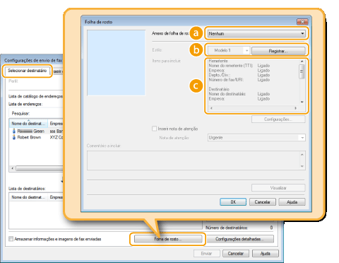 Você pode anexar a folha de capa ao documento que está enviando. Selecione uma folha de capa a partir de três modelos de capa pré-definidos no driver de fax ou crie sua próprias capas personalizadas. Para mais informações, clique em [Ajuda] na tela de fax do driver.