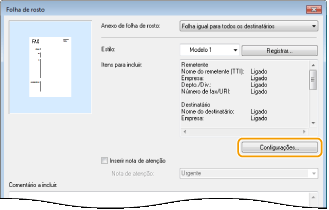 Exibe os itens que serão incluídos em uma folha de rosto. Para alterar os itens a serem incluídos, clique em [Configurações].