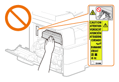 O interior da máquina e a ranhura de saída ficam muito quentes durante ou imediatamente após o uso. Evite contato com estas áreas para prevenir queimaduras. Além disso, o papel impresso pode estar quente imediatamente após sua saída, portanto, tome cuidado ao manuseá-lo.