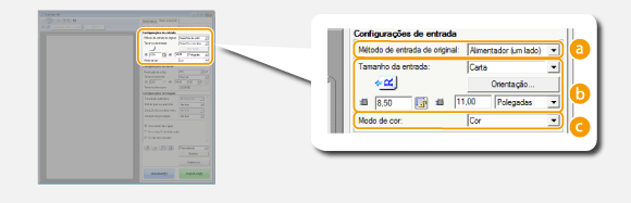 Especifique o método de entrada de documentos (a superfície de vidro ou alimentador), tamanho do documento, modo cor e outras configurações.