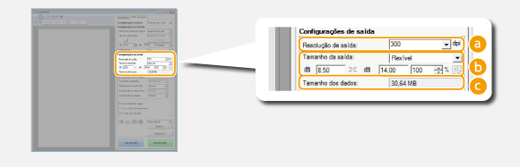 Se você dobrar a resolução de saída, o arquivo de imagem aumenta por um fator de 4. Se o tamanho do arquivo for muito grande, pode ocorrer uma escassez de memória ou outro erro. Configure a resolução para a mínima necessária para seu uso pretendido.