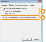 A tela [ScanGear MF] fecha automaticamente após a digitalização ser concluída. A tela podem fechar automaticamente com alguns aplicativos independente dessas configurações.