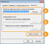 Você pode especificar a música ou os sons reproduzidos enquanto a máquina estiver digitalizando ou quando a digitalização estiver concluída. Clique em [Procurar] para especificar um arquivo a ser reproduzido. Os seguintes formatos de arquivo (extensões) são suportados: