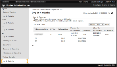 Você pode verificar os registros de uso de cartuchos e outros registros. A tela pode ser alterada para cada cor de cartucho de toner.
