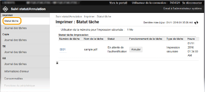 Cliquez sur [Numéro de tâche] pour les documents dont l'impression est suspendue et les documents sécurisés pour afficher leurs informations détaillées. Vous pouvez vérifier le nom de l'utilisateur et le nombre de pages sur le document imprimé.