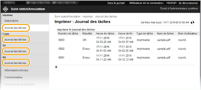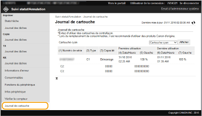 Connectez-vous à l'interface utilisateur distante (Démarrage de l'interface utilisateur distante) [Suivi statut/Annulation] [Journal de cartouche]