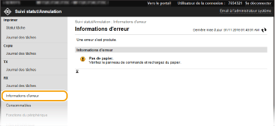 En cas d'erreur, cette page s'affiche lorsque vous cliquez sur le message figurant sous [Informations d'erreur] dans la page de portail (page principale). Écran de l'interface utilisateur distante