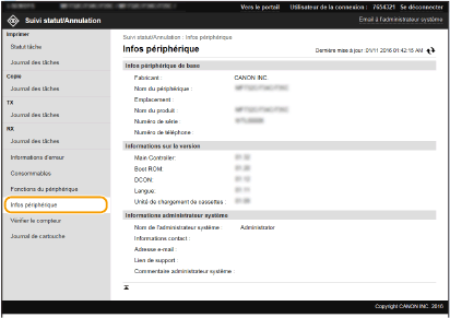 Les informations sur l'appareil et l'administrateur système s'affichent. Le nom de l'appareil et d'autres informations sur l'administrateur système affichés ici correspondent aux informations définies dans [Informations administrateur système] à la page [Gestion de l'utilisateur] ou dans [Réglages infos sur le périphérique] à la page [Gestion du périphérique].