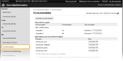 Le format et le type de papier de la source ainsi que le numéro de modèle de cartouche de toner, notamment, sont également affichés. Vous pouvez également cliquer sur [Vérifier les détails des consommables], dans la page du portail (page principale) pour afficher cette page (Écran de l'interface utilisateur distante).