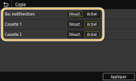 Pour chaque alimentation papier à laquelle vous voulez appliquer la fonction de sélection automatique de l'alimentation papier, sélectionnez <Activé>.