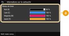 Affiche la quantité d'encre restante dans les cartouches de toner. D'autres pièces internes peuvent atteindre leur fin de vie avant l'épuisement du toner.