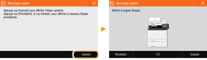 Retirez sans forcer le papier coincé de l'appareilLe retrait en force du papier risque d'endommager des pièces. Si vous ne parvenez pas à enlever le papier, contactez votre revendeur agréé Canon ou composez le numéro d'assistance téléphonique de Canon. Lorsqu'un problème ne peut pas être résolu