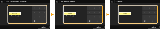 Para cancelar las opciones de ID y PIN del administrador del sistema, borre la información introducida en  y seleccione <Aplicar> con los campos en blanco.