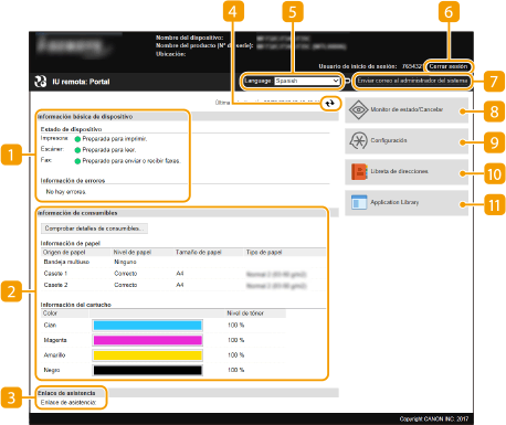 Al iniciar sesión en la IU remota aparece la siguiente página del Portal. En esta sección se describen los elementos que aparecen en la página del Portal y las operaciones básicas.