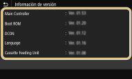 Puede comprobar la versión del firmware desde el panel de control del equipo. Cuando termine de actualizar el firmware, compruebe que la actualización ha sido correcta. Comprobación de la versión del firmware