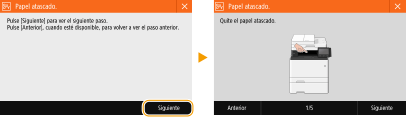 Si se produce un atasco de papel, <Papel atascado.> aparecerá en la pantalla. Seleccione <Siguiente> para mostrar algunas soluciones sencillas. Si le resulta difícil entender los procedimientos de la pantalla, consulte las secciones siguientes sobre eliminación de atascos.
