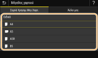 ![]() ![]() Αν καταχωρήσετε το μέγεθος του χαρτιού που χρησιμοποιείτε συχνά στα πλήκτρα <S1> έως <S3>, μπορείτε να τα εμφανίζετε με το πάτημα ενός πλήκτρου. Καταχώριση χαρτιού ειδικού μεγέθους