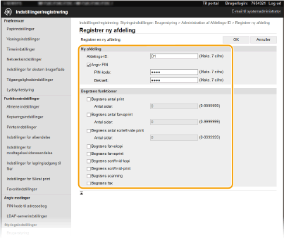Registrer et afdelings-id og konfigurer en pinkode for det. Registrer alle de afdelings-id'er, der skal administreres.