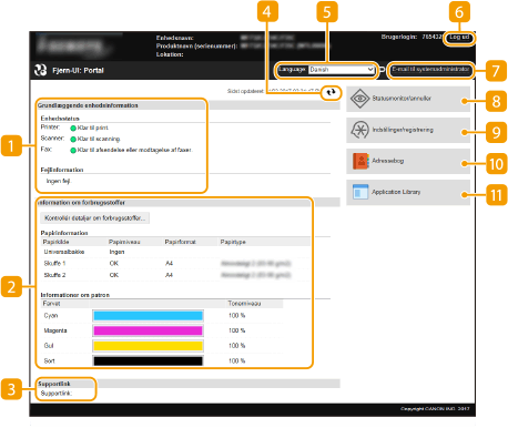 Når du logger ind på Brugerinterface til fjernbetjening, vises følgende portalside. I dette afsnit beskrives de emner, der vises på portalsiden og de grundlæggende handlinger.