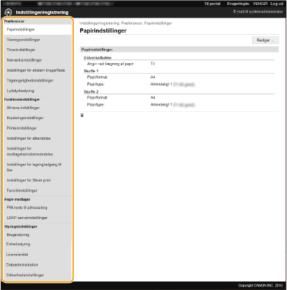 Du kan ændre de forskellige indstillinger for maskinen ved at bruge Brugerinterface til fjernbetjening. De fleste indstillinger kan også angives i maskinen, men nogle indstillinger kan kun angives ved at bruge Brugerinterface til fjernbetjening. I dette afsnit beskrives den grundlæggende proces for at ændre maskinens indstillinger ved hjælp af Brugerinterface til fjernbetjening.