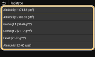 Hvis den skærm, der er angivet herover, ikke vises, når der er ilagt papirHvis du altid ilægger det samme papir i universalbakken, kan du springe betjeningen af papirindstillingerne over ved at registrere papirformatet og papirtypen som standardindstillingen. Når standardindstillingen er blevet registreret, vil den skærm, der er angivet herover, imidlertid ikke blive vist. Hvis du vil vise skærmen, skal du vælge <Angiv ved ilægning af papir> (Registrering af standardpapirindstillinger for universalbakken).