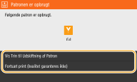 Hvis der vises en meddelelse for den sorte tonerpatron, når maskinen modtager en fax, eller hvis automatisk rapportoutput er indstillet, gemmes modtagne faxer og rapporter i hukommelsen, så de ikke forekommer falmede ved udskrift. Hvis du vil fortsætte med at udskrive, selvom der næsten ikke er mere toner i tonerpatronen, skal du indstille <Forts. udskr. ved patron lav> til <Til>. <Forts. udskr. ved patron lav>