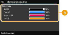Viser den mængde toner, der er tilbage i tonerpatronerne. Andre interne dele kan nå slutningen af deres levetid, inden toneren er opbrugt.