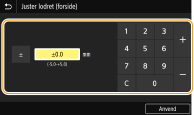 Hvis du justerer udskrivningspositionen, skal du angive retningen ved hjælp af "+" og "-" for afstanden ved hjælp af "mm". For <Juster lodret (forside)>/<Juster lodret (bagside)> skal du angive en værdi med et "+" tegn for at skifte udskrivningsposition i op/ned retning. For <Juster vandret (forside)>/<Juster vandret (bagside)> skal du angive en værdi med et "+" tegn for at skifte udskrivningsposition i venstre/højre retning. For at skifte til modsat retning skal du bruge en værdi med et "-" tegn.