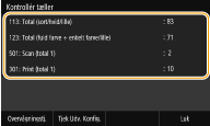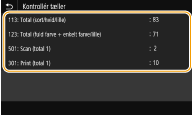 Du kan kontrollere forskellige samlede antal sider brugt til farve- og sort/hvid-udskrifter. Disse samlede antal omfatter faxer, rapporter og lister ud over kopier og udskrifter af data fra computere.