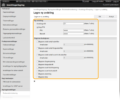 Registrer en avdelings-ID, og angi en PIN-kode for den. Registrer alle avdelings-ID-ene som skal administreres.