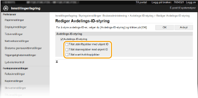 Aktivere avdelings-ID-styring for jobber fra datamaskinen). Hvis det imidlertid er merket av i boksen for denne innstillingen, utføres jobbene selv hvis ID og PIN-kode ikke er skrevet inn. Når du vil konfigurere en innstilling slik at ingen jobber uføres uten at korrekt avdelings-ID og PIN-kode skrives inn, fjernet du merket i boksen.