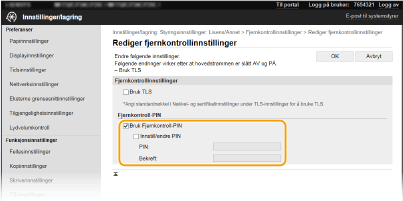 ![]() Bruke betjeningspaneletDu kan få tilgang til PIN-kodeinnstillingene for Fjernkontroll fra <Meny> på Hjem-skjermen. <Fjernkontrollinnstillinger>