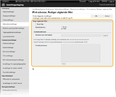 Hvis IP-adresser blir angitt feil, kan det hende at du ikke får tilgang til maskinen fra Fjernkontroll. I så fall må du angi <IPv4-adressefilter> eller <IPv6-adressefilter> til <Av>.