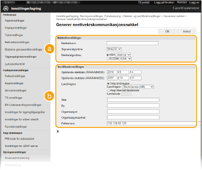 En nøkkel og sertifikat kan genereres med maskinen når det er nødvendig for kryptert kommunikasjon via Transport Layer Security (TLS). Du kan bruke TLS når du har tilgang til maskinen via Fjernkontroll. Egensignerte sertifikater brukes sammen med nøkkelen og sertifikatet som genereres i "Nettverkskommunikasjon".