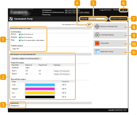 Når du logger inn på Fjernkontroll, vises følgende Portalside. Denne delen beskriver elementene som vises på Portalsiden og de grunnleggende handlingene.