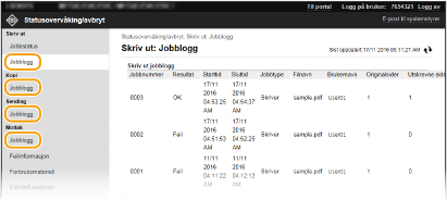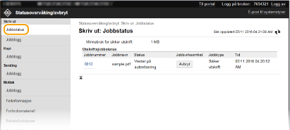 Klikk på [Jobbnummer] på sikre dokumenter og dokumenter som er midlertidig stanset, for å vise detaljert informasjon. Du kan kontrollere brukernavnet og sideantallet for det utskrevne dokumentet.