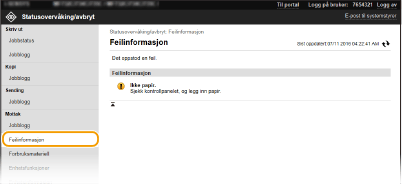 Når det oppstår en feil, vises denne siden ved å klikke på meldingen som vises under [Feilinformasjon] på portalsiden (hovedsiden).