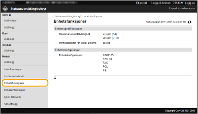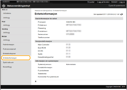 Informasjon om maskinen og systemstyrer vises. Enhetsnavnet og annet systemstyrerinformasjon som vises her, er tilknyttet innstillingene i [Informasjon om systemstyrer] på siden [Brukeradministrering] eller i [Innstillinger for enhetsinformasjon] på siden [Enhetsstyring].