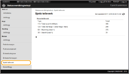 Det totale antallet sider som er skrevet ut via funksjonene for kopiering, utskrift og faks, vises.