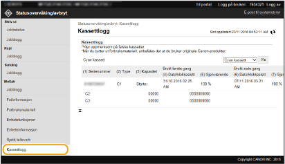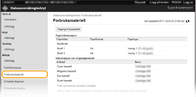 Papirformat og -type for papirkilden, modellnummeret for tonerkassetten osv. vises. Du kan også klikke på [Kontroller detaljer for forbruksmateriell] på Portalsiden (hovedsiden) hvis du vil vise denne siden (