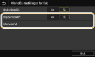 Lar deg skrive ut mottaksresultatrapporter hver gang dokumenter lagres i minnet. Hvis du vil skrive ut rapporter, velger du <På>. Du må også stille <Resultatrapport for RX> inn til <På>.