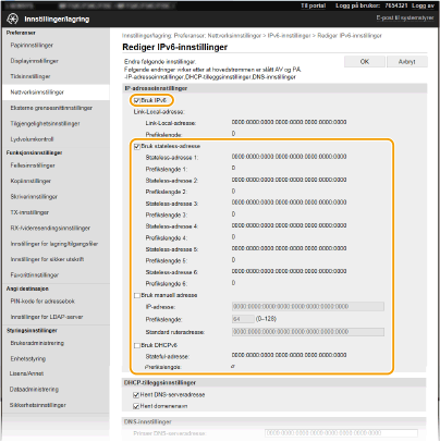 IPv6-adressene for maskinen kan konfigureres via Fjernkontroll. Før du angir IPv6-adresser, må du kontrollere IPv4-adresseinnstillingene (Vise IPv4-innstillinger). Du må angi riktige IPv4-innstillinger for å kunne bruke IPv6-adresser. Legg merke til at skannefunksjonen som bruker skannerdriveren eller MF Scan Utility, ikke er tilgjengelig i et IPv6-miljø. Maskinen kan bruke følgende IPv6-adresser: