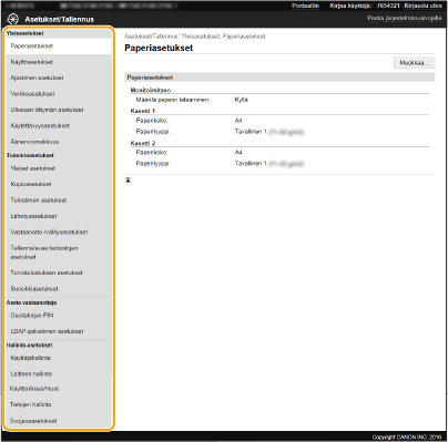 Voit muuttaa laitteen eri asetuksia etäkäyttöliittymän avulla. Useimmat asetukset voidaan määrittää myös laitteessa, mutta jotkin asetukset voidaan määrittää vain etäkäyttöliittymällä. Tässä osiossa kuvataan laitteiden asetusten muuttamisen peruskulku etäkäyttöliittymää käytettäessä.