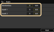 Määritä aina <Kyllä> vähintään kohteelle <Kasetti 1> tai <Kasetti 2>. Jos molemmille määritetään <Ei>, asetusmenettelyä ei voi suorittaa loppuun.