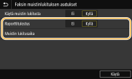 Tämän avulla voit tulostaa vastaanotin tulosraportit aina, kun asiakirjoja tallennetaan muistiin. Tulosta raportit valitsemalla <Kyllä>. Lisäksi <Vastaanoton tulosraportti> ‑asetukseksi täytyy valita <Kyllä>.
