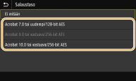 <Acrobat 10.0 tai vastaava/256-bit AES> ‑salaus voidaan vaihtaa <Acrobat 9.0 tai vastaava/256-bit AES> ‑salaukseksi toisella yhteensopivalla versiolla.