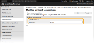 Valitse tämä valintaruutu, kun haluat asettaa laitteen vastaamaan laitehallinnan ohjelmiston monilähetyshakupaketteihin ja ottaa käyttöön laitehallinnan ohjelmiston suorittaman valvonnan. ![]() Jos haluat muuttaa monilähetyshaun porttinumeron, katso kohtaPorttinumeroiden muuttaminen.