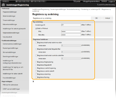 [Begränsa funktioner] Du kan begränsa antalet sidor som får skrivas ut och tillgängliga funktioner för avdelningarna som registreras. Markera kryssrutan för avsedd typ när du vill begränsa antalet sidor som ska kunna skrivas ut och ange antalet sidor i [Antal sidor]. Markera kryssrutan för avsedda funktioner när du vill begränsa funktioner.
