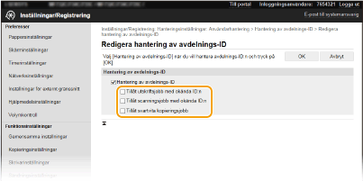 Aktivera Hantering av avdelnings-ID för jobb från en dator). Om kryssrutan för den här inställningen är markerad kan du dock skicka jobb utan att ange ID och PIN-kod. Avmarkera kryssrutan om du vill att rätt avdelnings-ID och PIN-kod ska behöva anges.